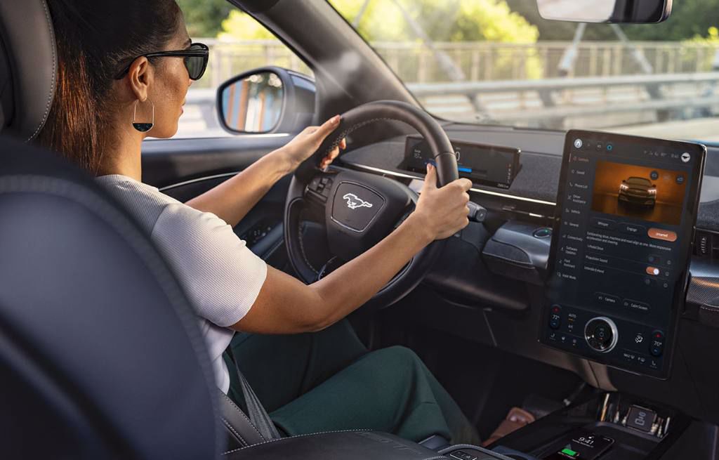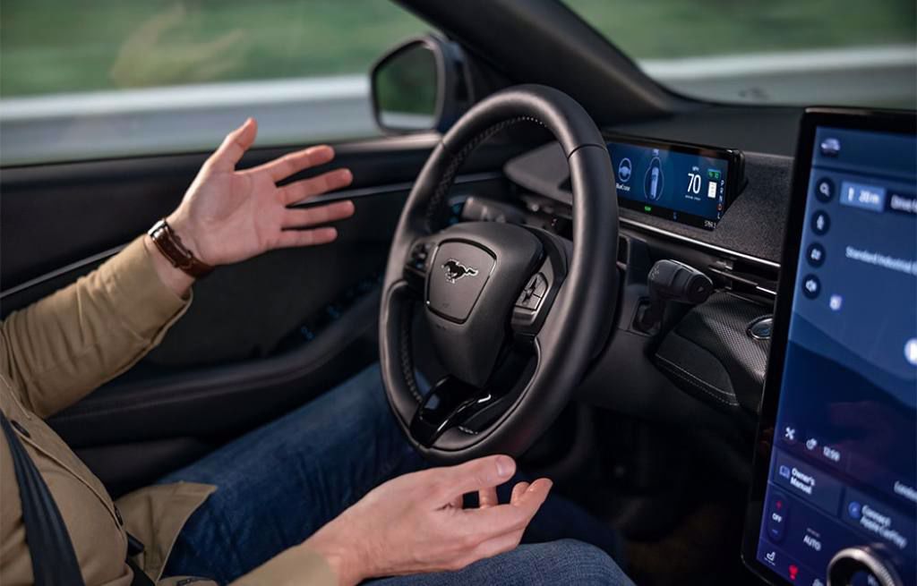 Handen over het stuur van de Mustang Mach-E met een beeld van de BlueCruise-technologie voor autonoom rijden⁷.